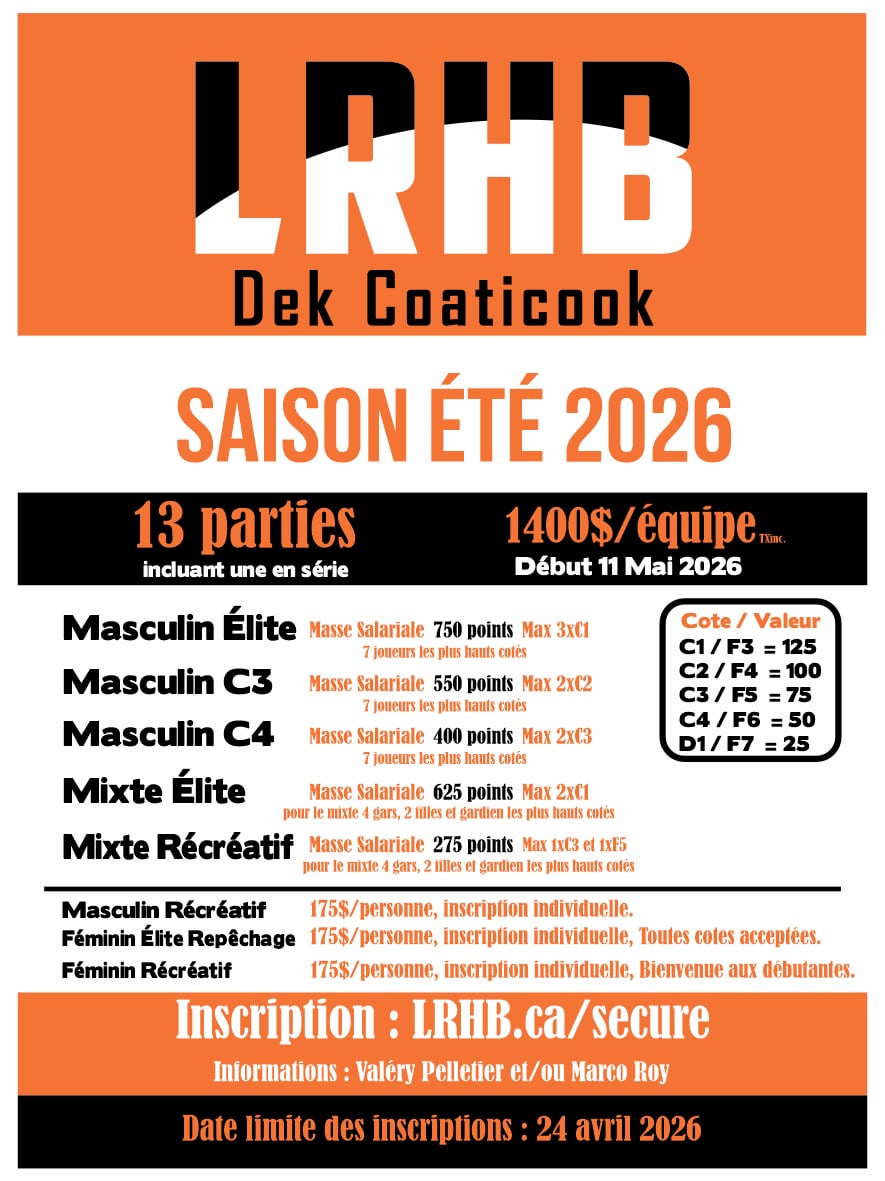 Il est maintenant le temps d’incrire votre équipe pour l’été 2026. Vous trouverez ci-joint le tableau des restrictions par catégories. À noter que si votre équipe ne peut se classer dans les catégories ci-jointes, écrivez-nous et nous verrons si nous pouvons trouver une solution.