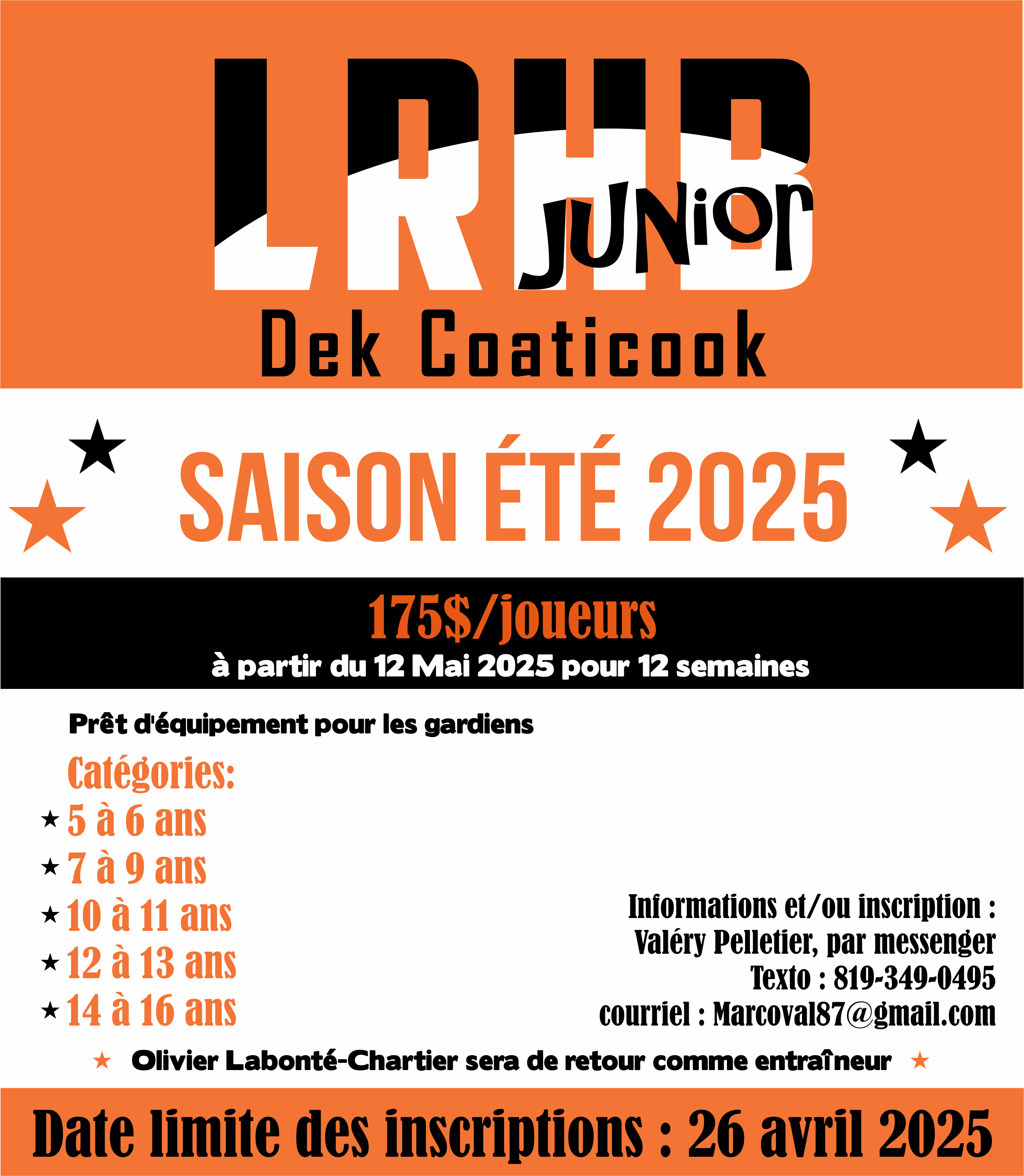 Inscriptions Inscrption Junior 2026 Par Ligue Riviera Hockey Balle Coaticook-mercredi 25 Fév 2026 Saison débutant le 11 mai, pour une durée de 11 semaines. Inscription en cours! Articles récents mercredi 25 Fév 2026 - 17:59 N / C Inscriptions été 2026 mercredi 25 Fév 2026 - 13:26 Inscriptions Inscrption Junior 2026 mardi 07 Oct 2025 - 13:51 N / C Champions 2025 mardi 12 Mar 2024 - 17:50 N / C Tutoriel d'inscription en ligne Plus de nouvelles